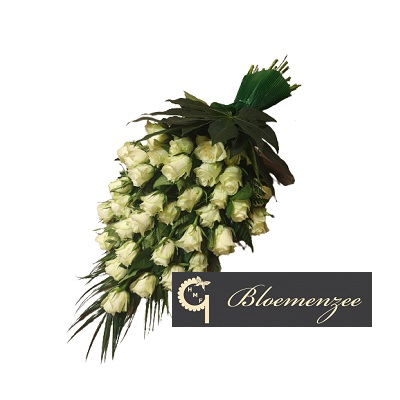 Een mooi wit rouwboeket met witte rozen opgemaakt en diversen soorten groen.